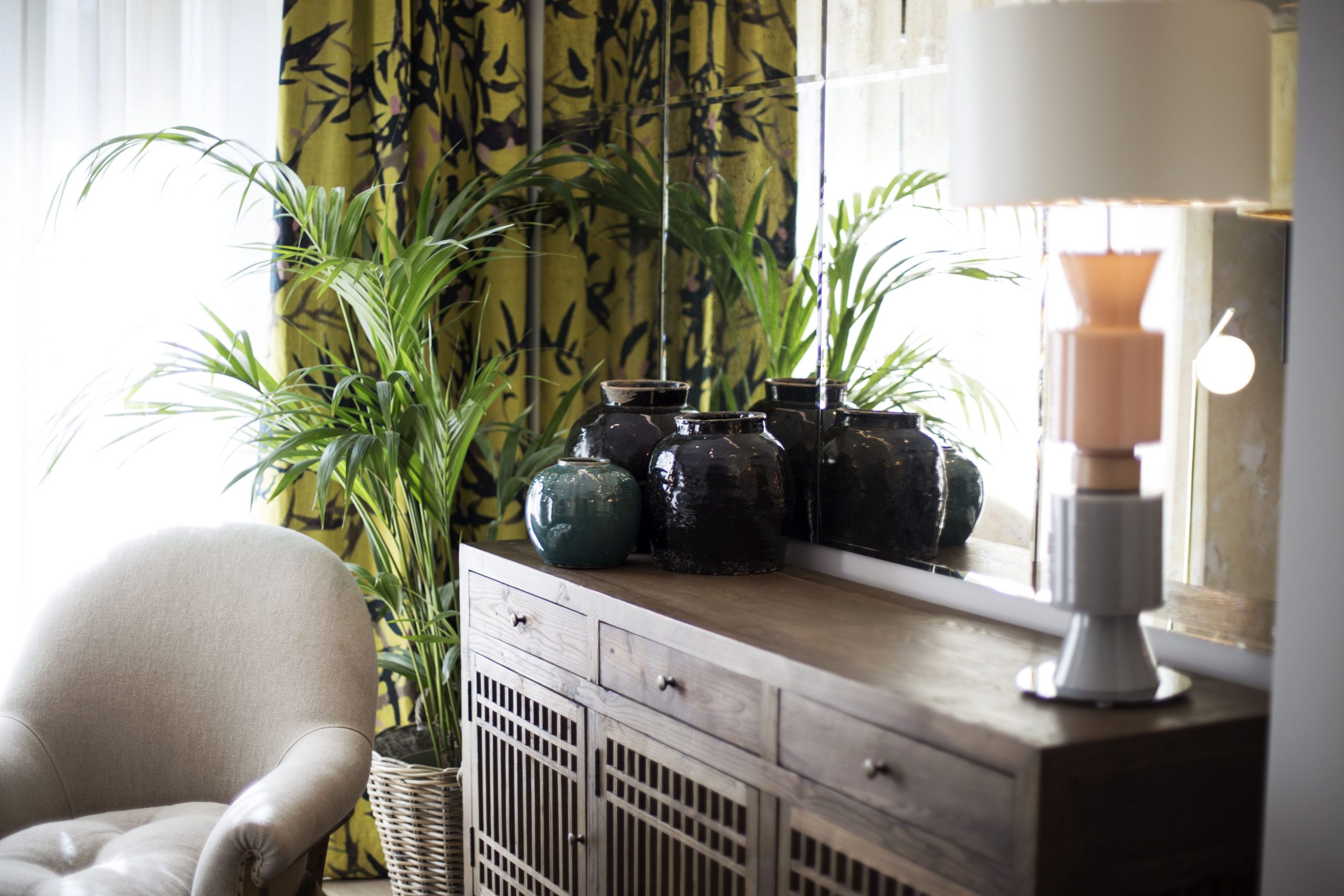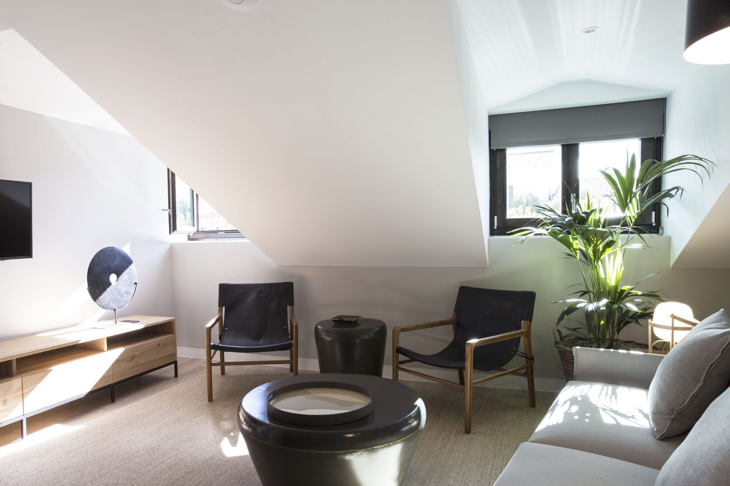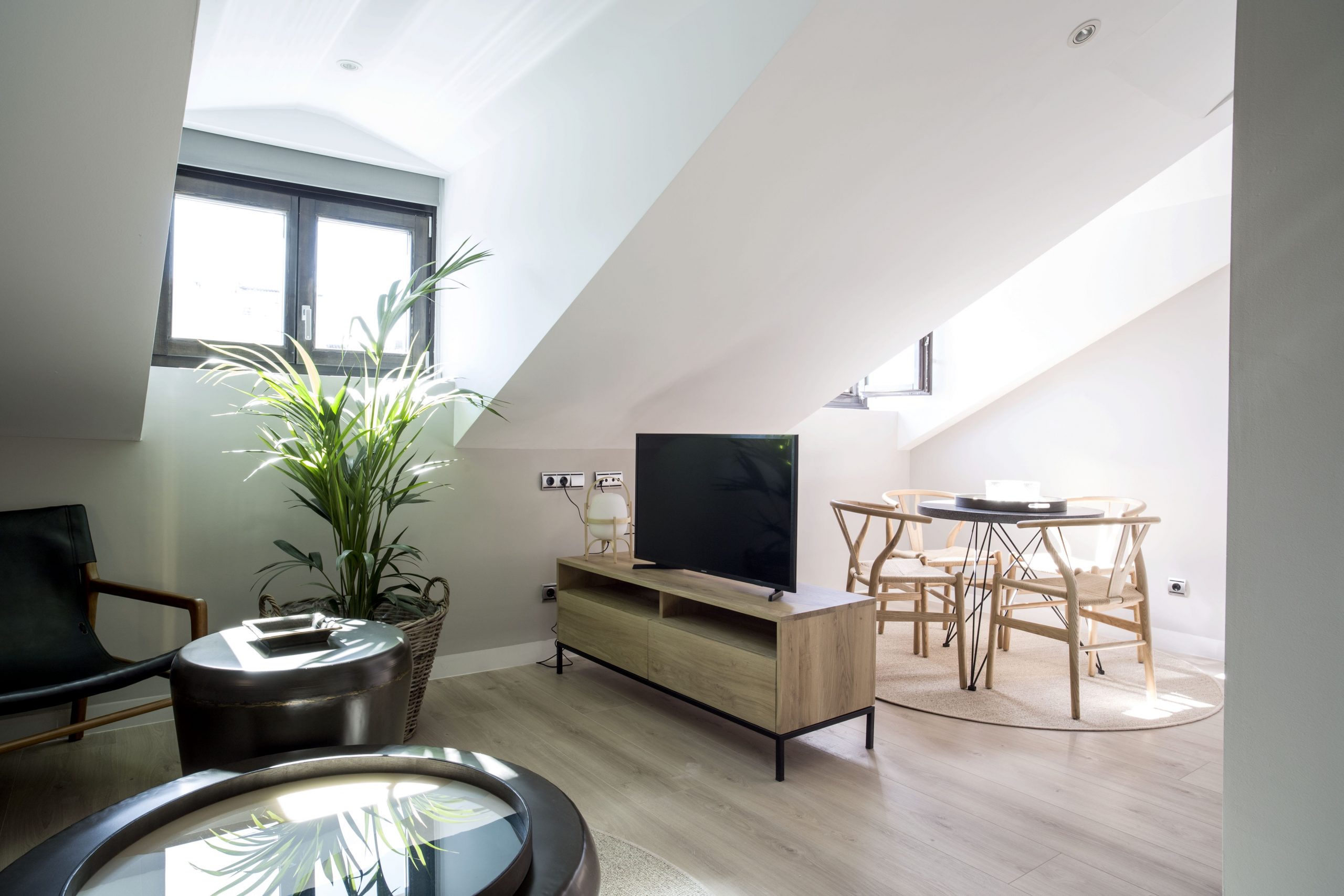 The interior design of these Madrid apartments blends modern sophistication with natural textures and vibrant accents. Velvet sofas in mustard tones add warmth and boldness to serene, neutral spaces. Organic materials—like wicker, wood, and linen—are complemented by lush indoor plants, creating a soft, welcoming atmosphere. Artful lighting fixtures and contemporary furniture contrast elegantly with traditional architectural details, giving each apartment a distinct yet harmonious identity.